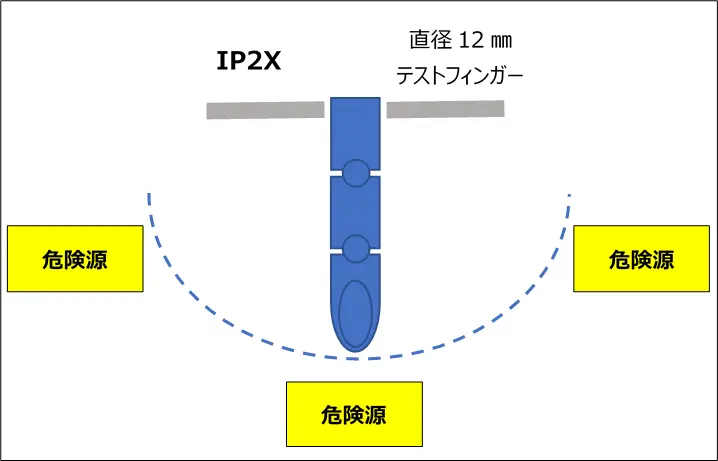 IPXXB は、テストフィンガーと危険源の間に適切な空間距離が確保されていることです。上図は、拳が接近できないので IP1XB とすることもできます。