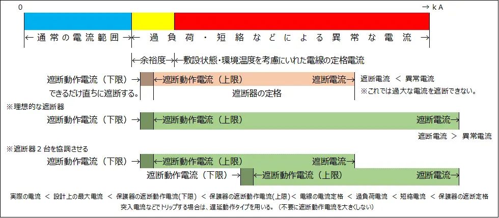 電線・ケーブルの環境温度や敷設状態、束ねた場合、ドラムに巻き付けている場合のディレーティング(低減率)を考慮した電線の許容電流に対して、上流の遮断器の動作電流がその値をこえないこと。また、短絡電流が、遮断器の遮断電流をこえないこと。