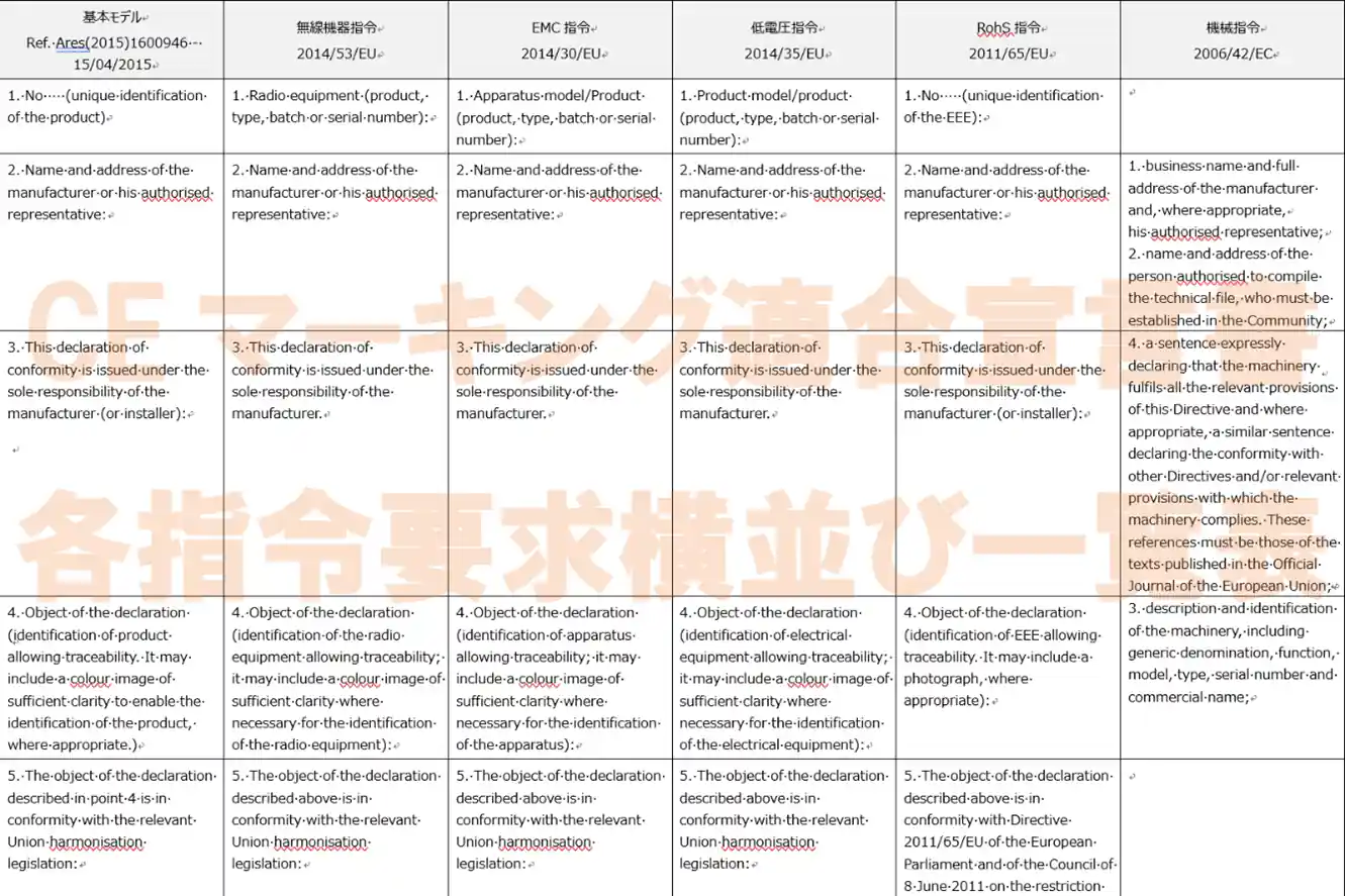 適合宣言書 記載要求事項の各指令横並び一覧表(英語)ワードファイル【無償】